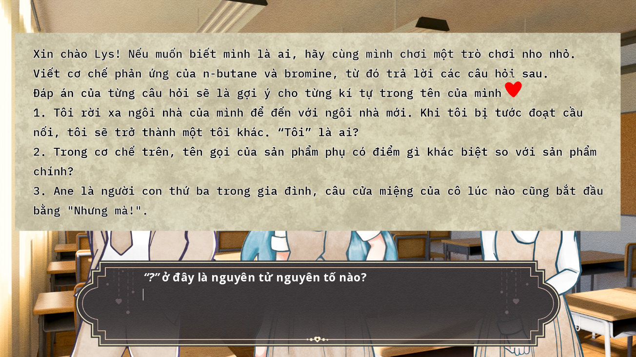 Phoenix là một tựa game Visual Novel được thiết kế nhằm hỗ trợ học tập chuyên đề "Cơ chế phản ứng trong hoá học hữu cơ" - Hoá học 12. Chúng tôi mong rằng thông qua tựa game này, các bạn sẽ có một góc nhìn mới mẻ hơn về môn Hoá học nói riêng và các bộ môn Khoa học nói chung.